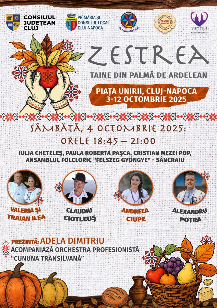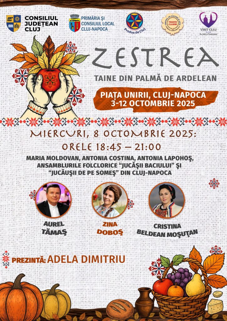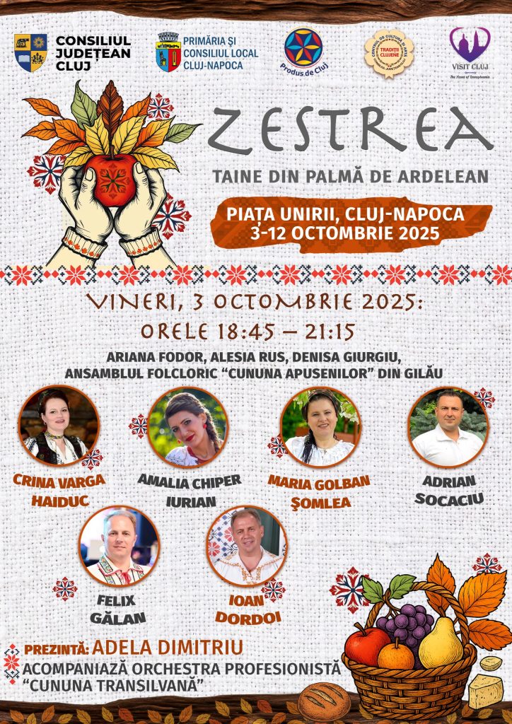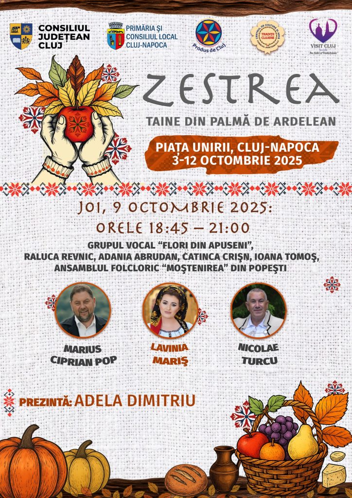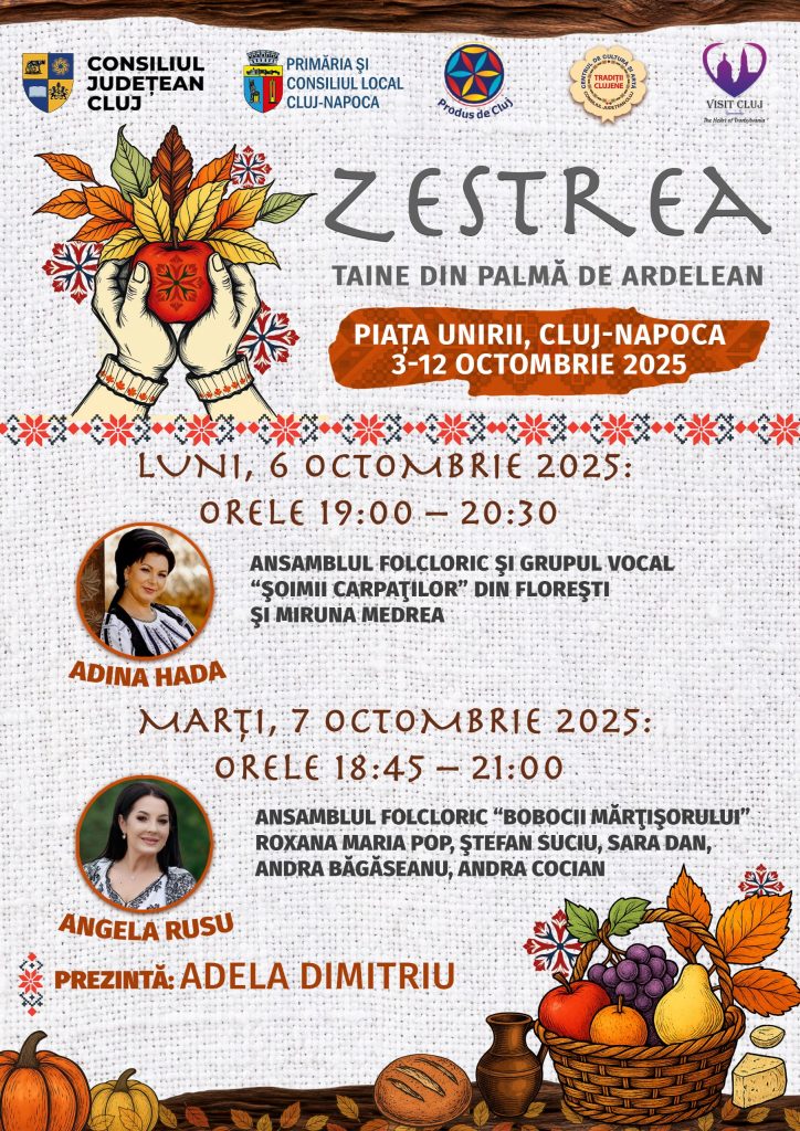 Consiliul Județean Cluj, prin Asociația Produs de Cluj, în parteneriat cu Primăria și Consiliul Local Cluj-Napoca, organizează, în perioada 3–12 octombrie 2025, în Piața Unirii, evenimentul „Zestrea – Taine din palma de ardelean”.