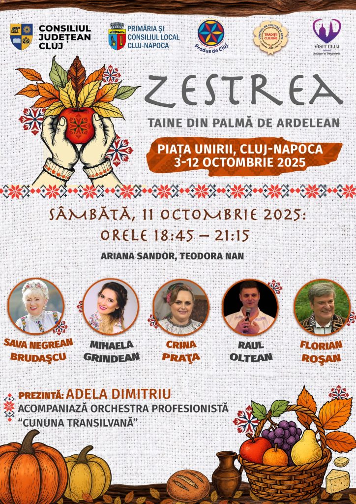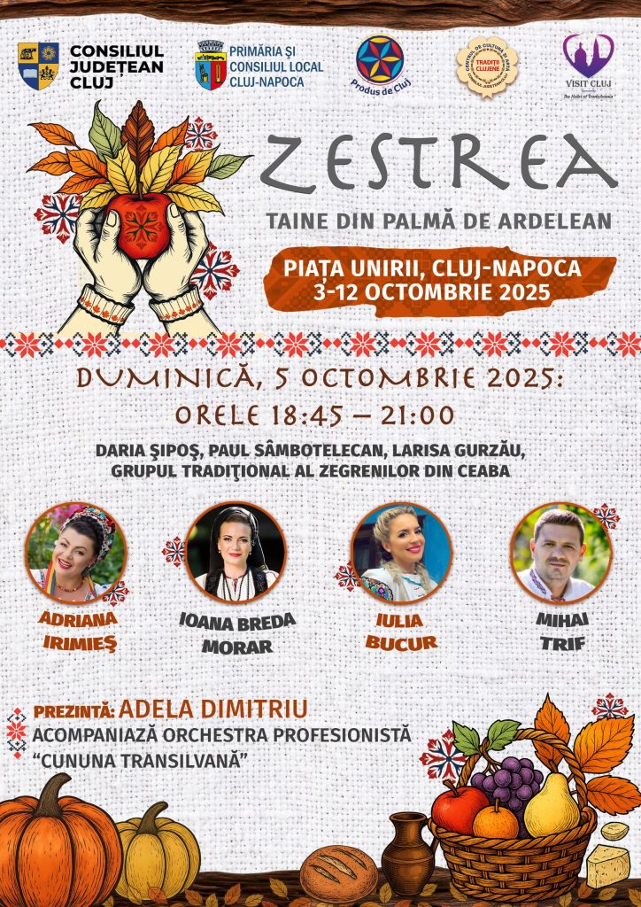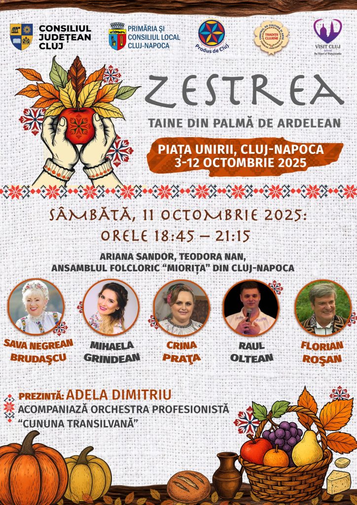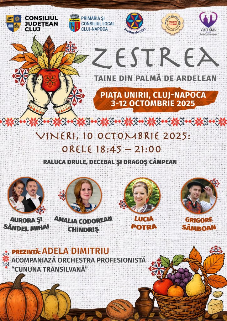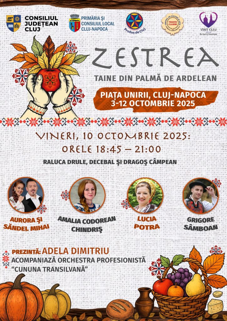 Consiliul Județean Cluj, prin Asociația Produs de Cluj, în parteneriat cu Primăria și Consiliul Local Cluj-Napoca, organizează, în perioada 3–12 octombrie 2025, în Piața Unirii, evenimentul „Zestrea – Taine din palma de ardelean”.